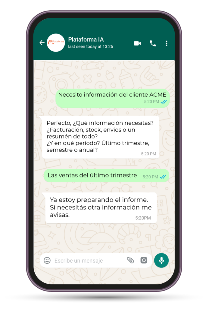 WhatsApp deja de ser solo un canal de mensajería para convertirse en parte del circuito operativo de tu empresa. A través de un agente conversacional conectado con Plataforma ERP podés realizar consultas al sistema de forma directa desde el celular, accediendo a información clave de manera rápida y simple. Dueños, gerentes, vendedores y clientes pueden realizar consultas ágiles y al instante.